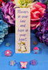 Let your pages bloom with gentle magic. This pastel pink bookmark features a serene white-and-gray cat crowned in golden blossoms, nestled among soft florals and leafy greens. The handwritten-style quote—“Flowers in your hair and hope in your heart”—adds a tender reminder to carry beauty and optimism wherever you go.