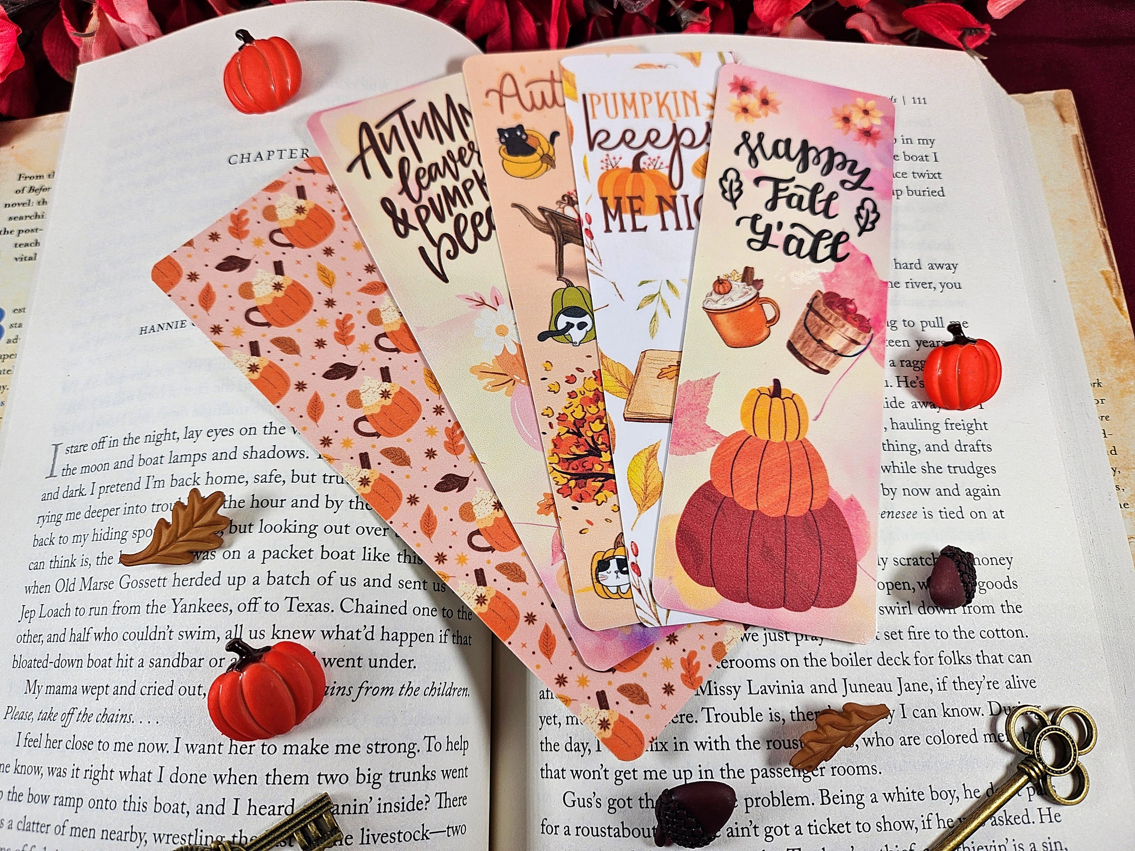 Wrap yourself in the warmth of fall with this charming collection of seasonal bookmarks celebrates the magic of crisp leaves, warm drinks, and cuddly companions.